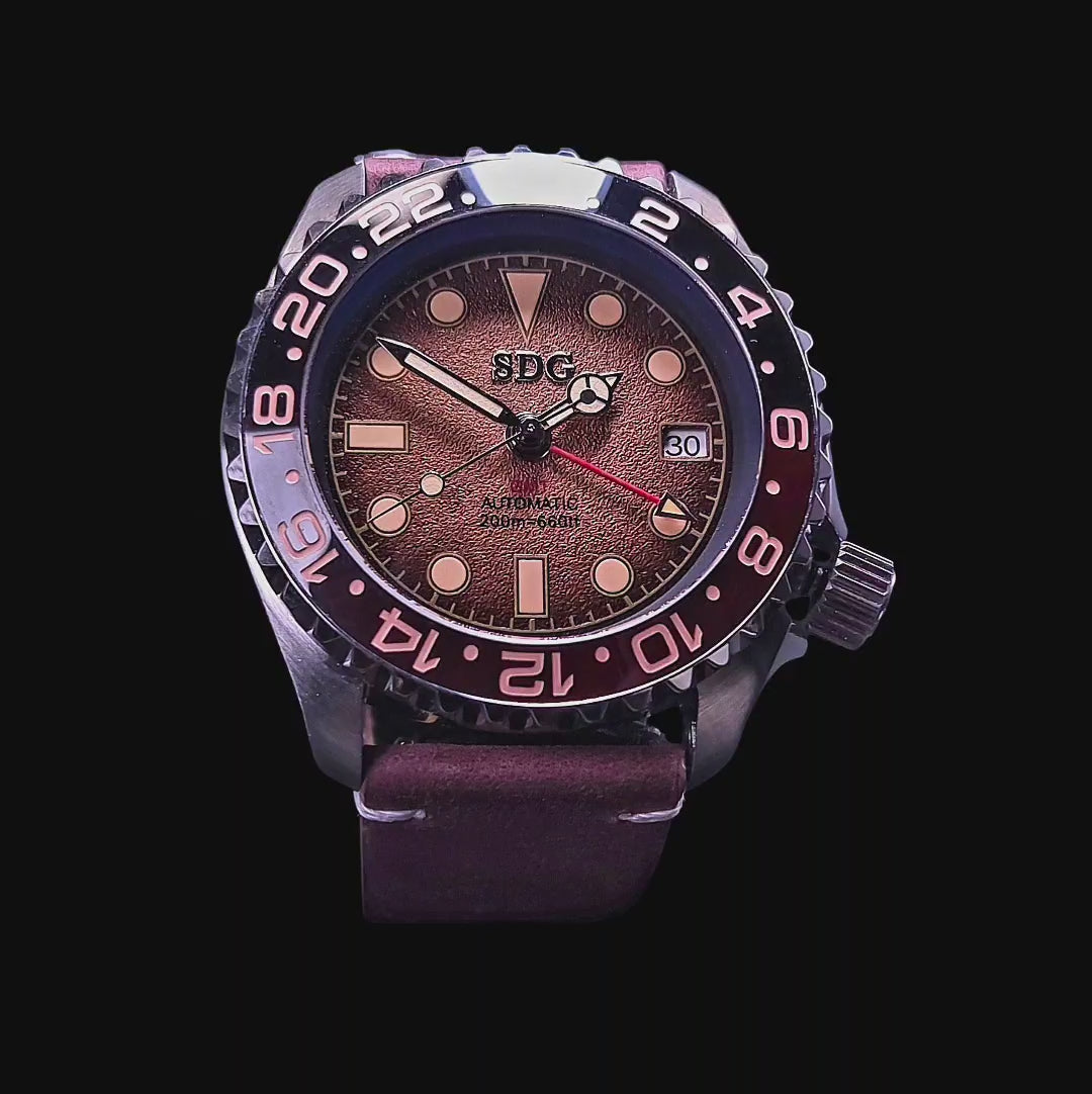 Experience the iconic Mod SKX Yacht Diver design. This watch was specially designed by for our client "Shaun" and reinterpreted by Modtime Creations. The Shaun "Root Beer" is for those who demand the perfect combination of style and durability. Each 42 mm masterpiece is built for both the collector and active wearer, pairing the renowned Japanese NH34 GMT automatic movement with a robust, visually striking case.